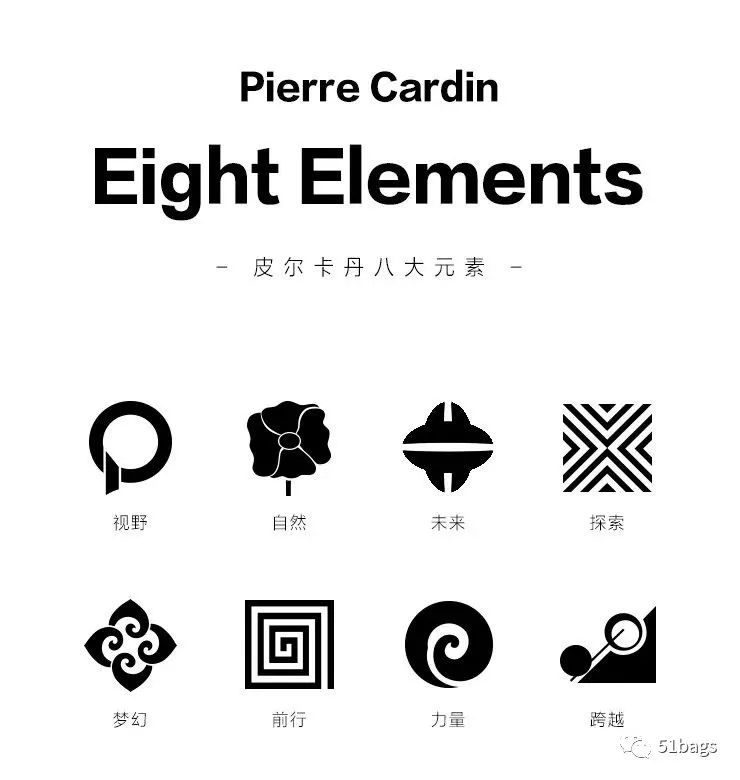 基于半个多世纪沉淀的品牌文化,提炼出视野、自然、未来、探索、梦幻、前行、力量、跨越八大品牌元素,构成皮尔卡丹专属图腾,并运用于长期的产品创作之中。八大元素如同千变万化的万花筒,跟随不同时段的潮流趋势,进行灵活性变化及组合,呈现时尚与艺术的视觉冲击,带来专属于皮尔卡丹的品牌印记。